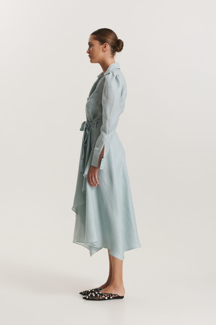 HOME - CLOTHING - Dresses - Midi-Aqua Ruffled Linen Midi Dress