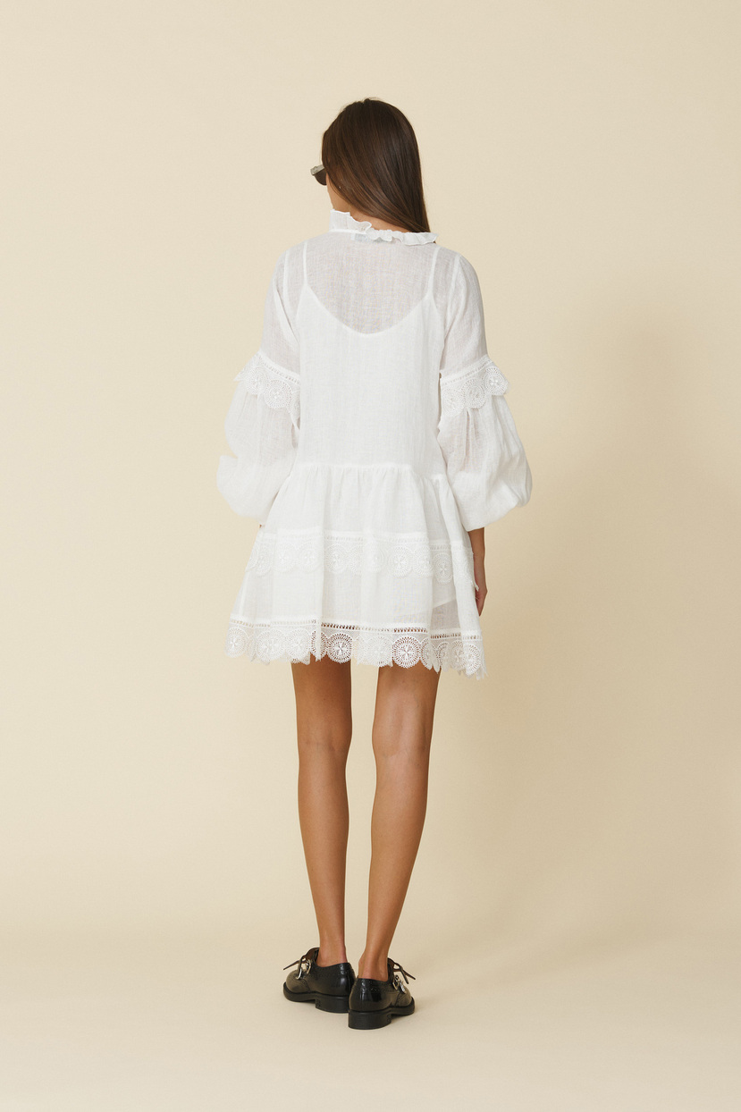 HOME - CLOTHING - Dresses - Mini-White Linen Mini Dress With Lace Inserts
